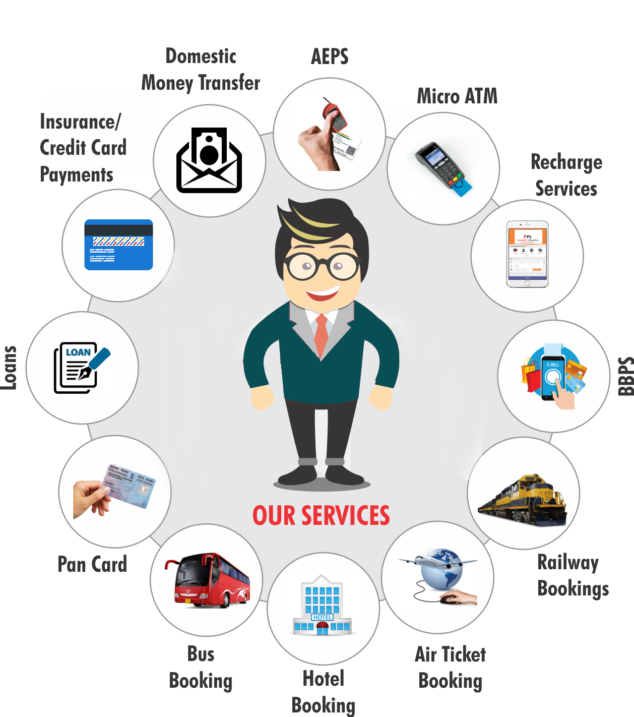 System (Electricity, Landline, Mobile Bill Payment), Aadhaar Enabled Payment System (AEPS), Domestic Money Transfer, Travel Booking (Train & Bus), Recharge (Mobile, Dth, Data Card) & mPOS Machine.